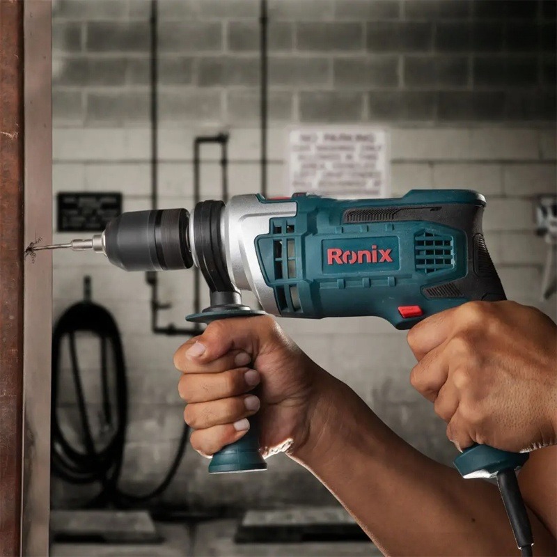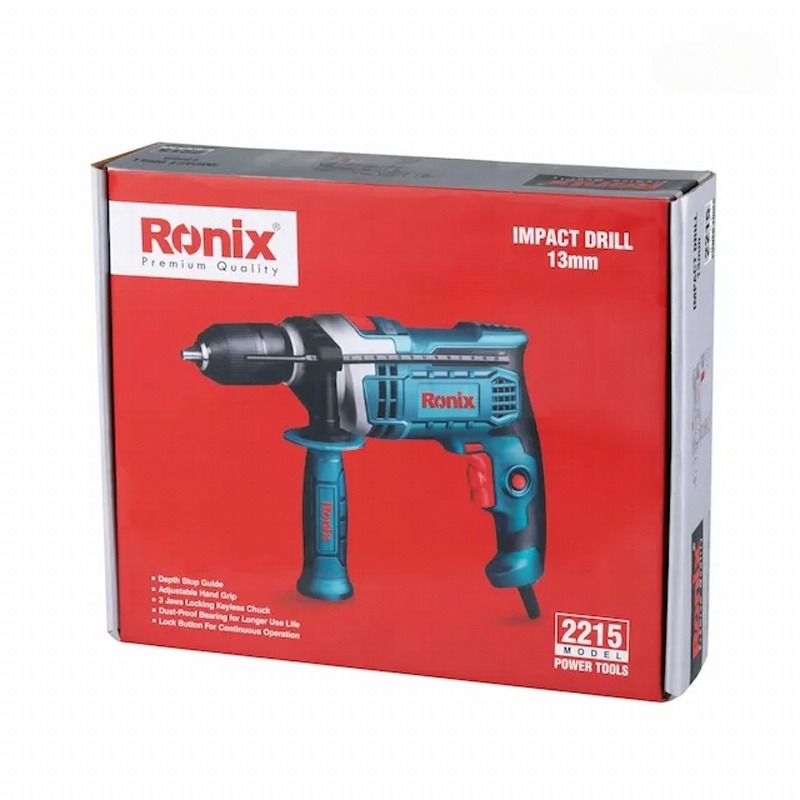 دریل برقی چکشی 13 میلیمتری رونیکس مدل 2215 از تجهیزات صنعتیای تشکیل شده که توسط تکنولوژیهای روز دنیا بررسی و تولید شدهاند. محصول مذکور دارای موتوری با توان 850 وات میباشد که دور گردشی معادل 0 تا 2800 دور بر دقیقه به صورت متغیر دارد که میتواند به سطوح چوبی تا عمق 25 میلیمتر و به سطوح فلزی و بتنی تا عمق 13 میلیمتر نفوذ کند. از ویژگیهای این دریل برقی میتوان به دارا بودن کلید گازی تنظیم سرعت و قفلکن سرعت و کلید چپگرد و راستگرد اشاره کرد که البته تمامی این کلیدها ضدگردوغبار میباشند.